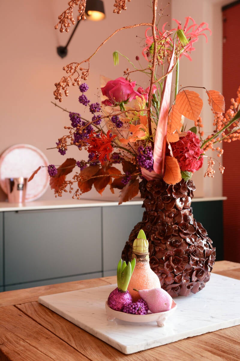 Voor op tafel heeft Flower Explosion veel glitter fruit en bloembollen als Amaryllis en Hyacinth. Al lekker feestelijk en fleurig. Je kunt mooie opgemaakte schalen kant en klaar kopen of je eigen schaal laten opmaken. Natuurlijk is het ook een optie om zelf creatief aan de slag te gaan. Ik mocht hier op tafel een groot en een klein opgemaakt schaaltje neerzetten. Je kunt het namelijk zo gek maken als je zelf wilt!