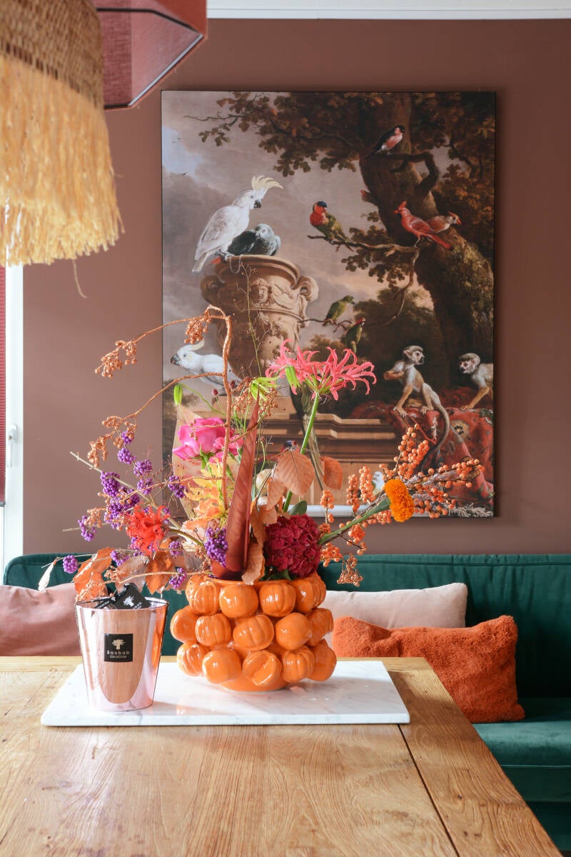 Voor dit blog ging ik weer aan de slag met een prachtig samengesteld boeket van Flower Explosion. Een tikkie herfst en een vleugje kerst. Mooie bessentakken en herfstblad in combinatie met een echte glittertak en goud gekleurd blad. Ook zit er een heerlijke exotische knipoog verstopt tussen deze bloemenpracht. Zie jij ‘m zitten? Wanneer jij op pad gaat voor een bijzonder boeket als deze, neem dan ons bloemen boodschappenlijstje met je mee! Zo tippen we je voor unieke bloemen combinaties. In dit boeket zit Calicarpa, Nerine, Ilex, Gloriosa, Hortensia, Roos, geprepareerd Beukenblad, geverfd Strelitzia blad, glitter Rozenbottel en een prachtige Trosanjer.