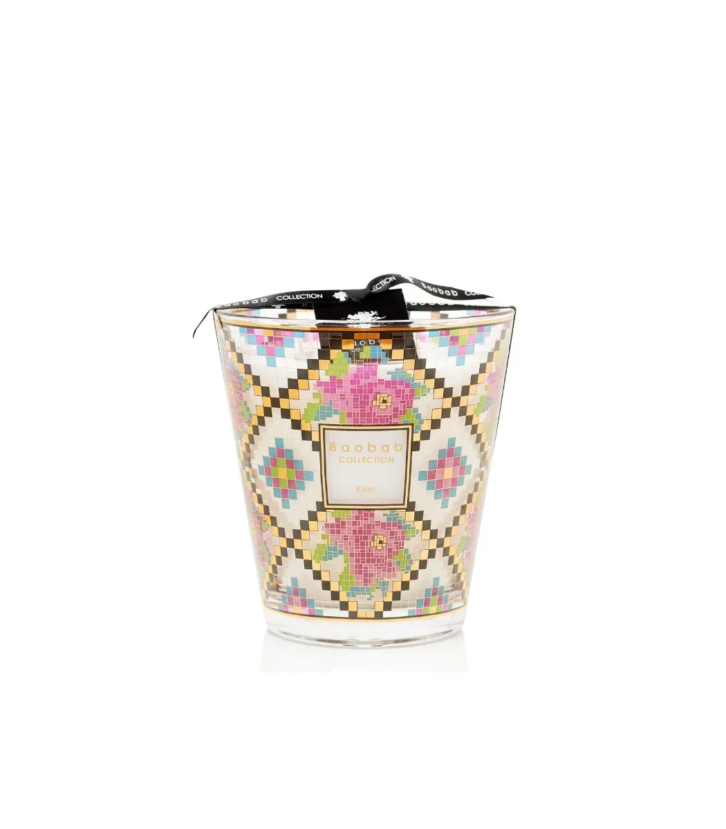 Het gezeefdrukt glas van de Kilim-kaars is voorzien van een kleurrijke print met gouden accenten in de typische stijl van de gelijknamige Moldavische tapijten. De decoratie wordt voorzichtig op het glas aangebracht in ons atelier. Vervolgens wordt het glas in een hete oven geplaatst zodat het materiaal perfect kan hechten. De authentieke geuren vormen een perfecte harmonie met het ambachtelijk ontwerp.