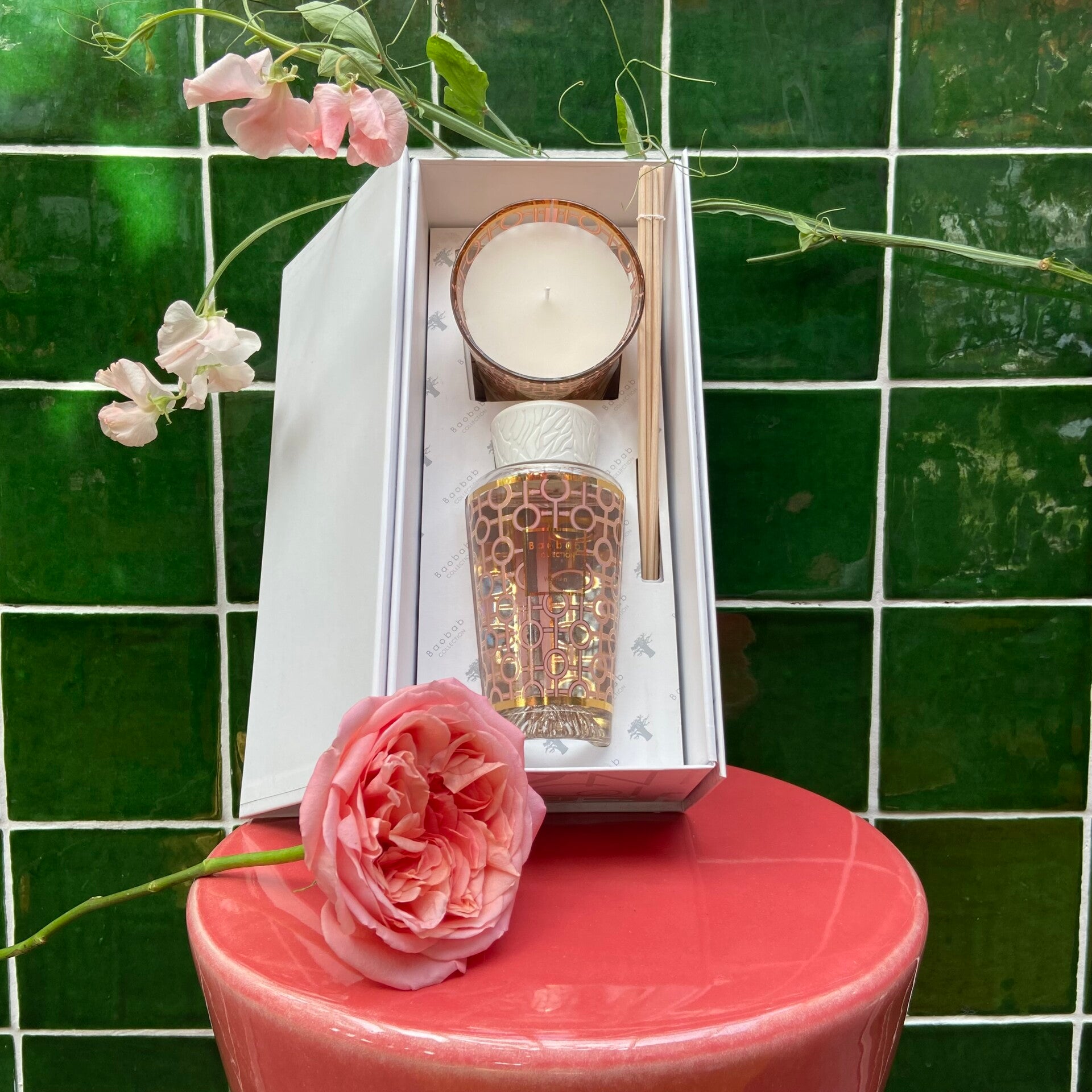 De geurkaars in glas en de luxe geurverspreider Dames zijn voorzien van een gouden en poederroze zeefdrukdecoratie. Deze decoratie wordt behandeld als een grafische print en vertegenwoordigt het vrouwelijke. De geur van poederachtige roos en musk maakt deze huisgeurset ultra-vrouwelijk.