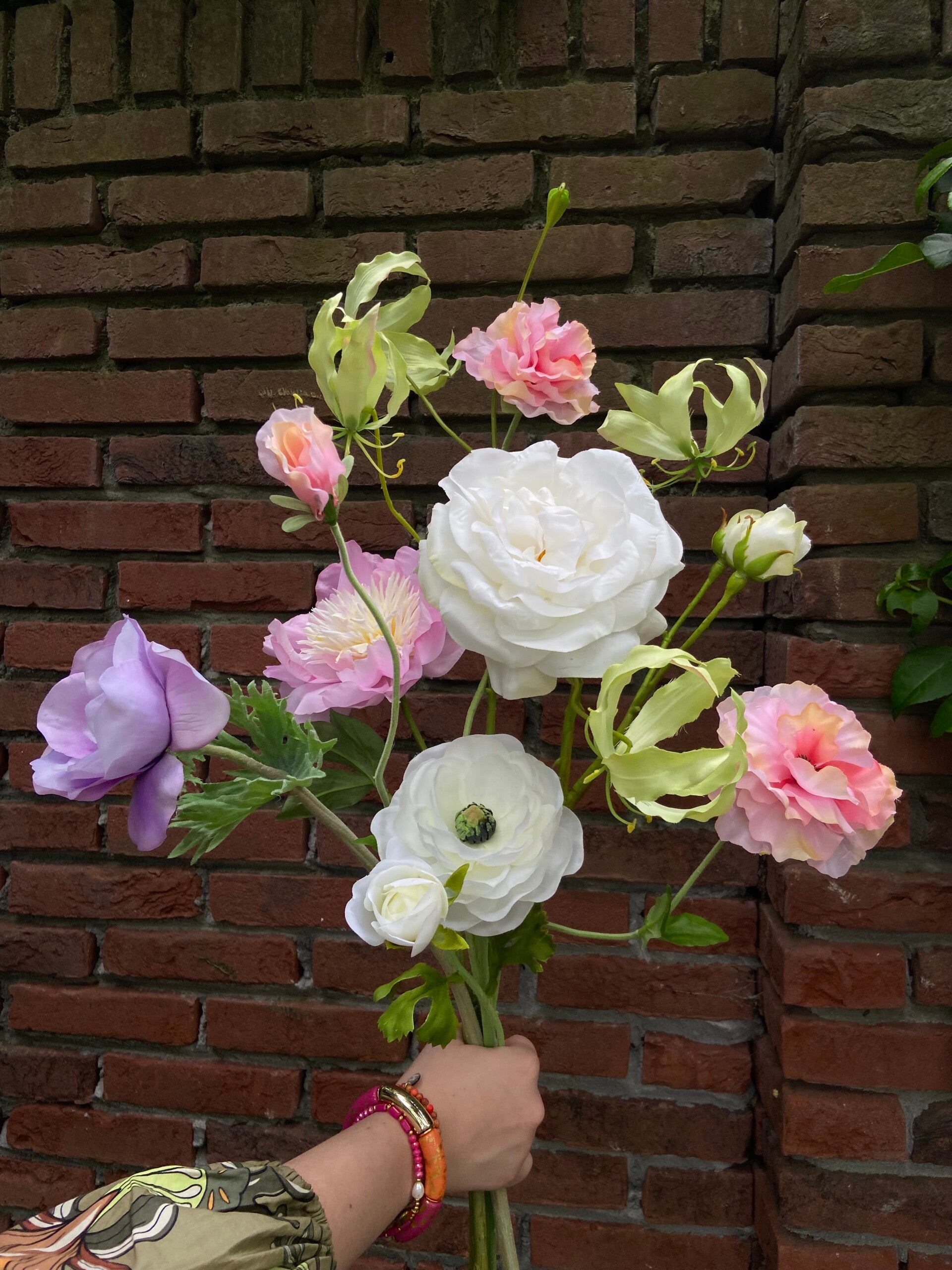Een zijden boeket in lichte tinten met de volgende bloemen!