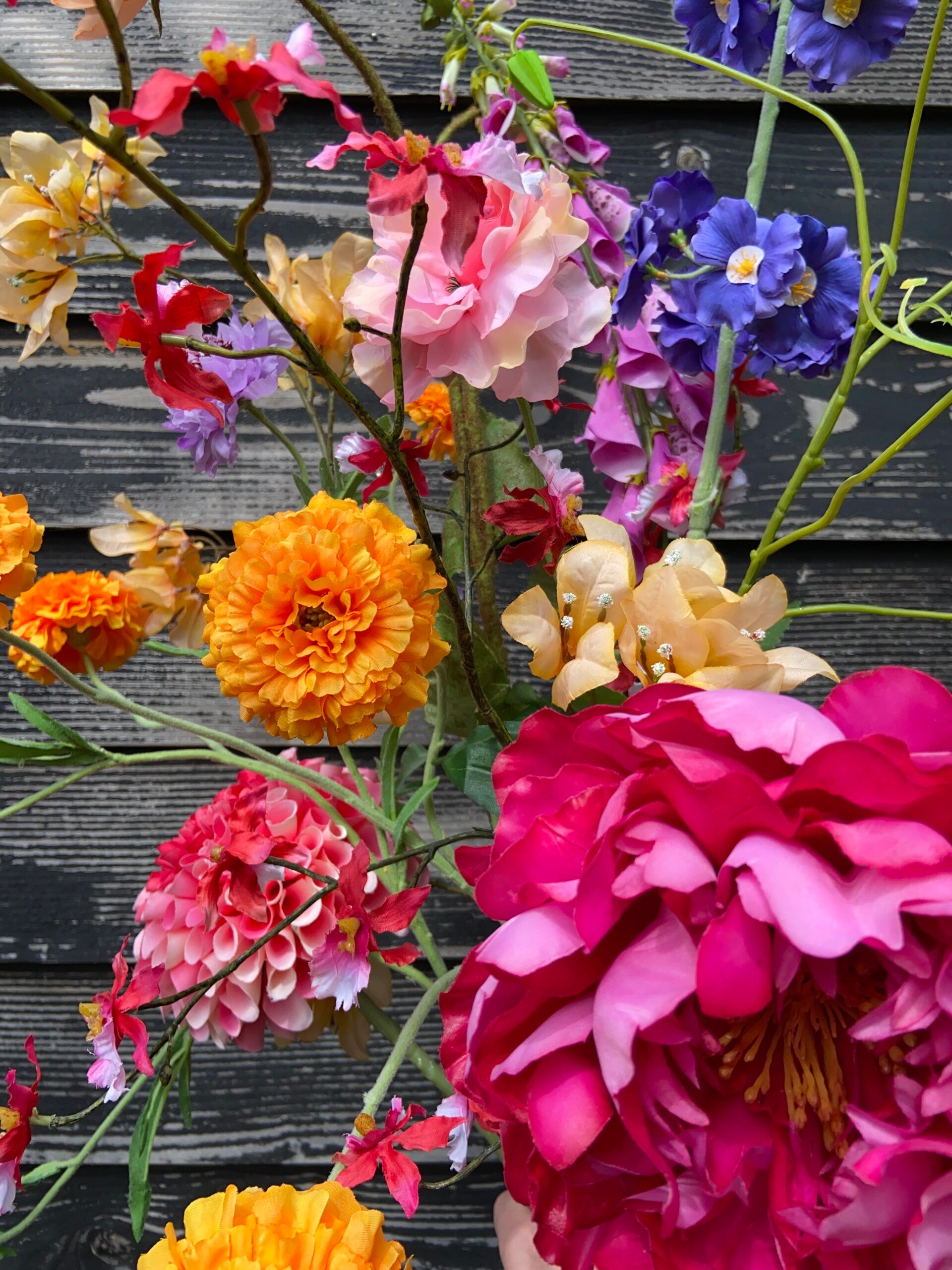 Een kleurrijk en gemixt zijden boeket met de volgende bloemen!