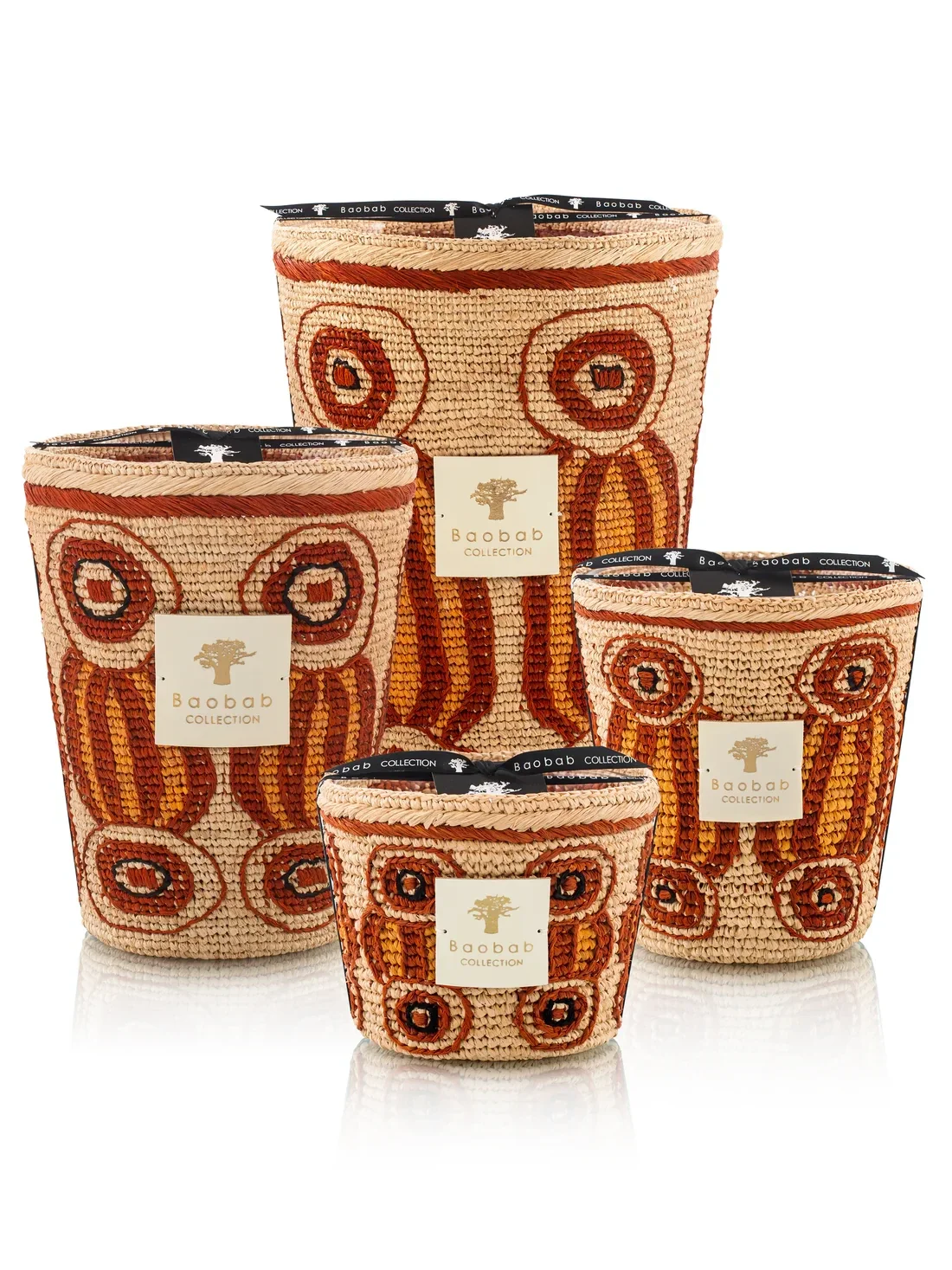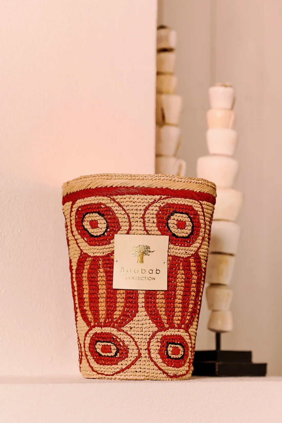 De Alasora geurkaars is bedekt met beige raffia waarop het aboriginal motief is geweven dat heilige plaatsen voorstelt en gekleurd met een mix van rode oker en zwart. Deze kaars is met de hand geweven door een vrouwencoöperatie in Madagaskar en heeft een Afrikaanse kleur.