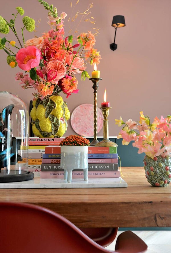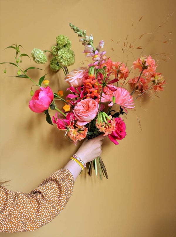 Dit boeket is in roze en oranje tinten en compact gebonden met echte voorjaarsbloemen. Hele toffe kleuren! Besteld u dit boeket in een ander seizoen, zullen de kleuren gelijk blijven. Op de foto is maat XL